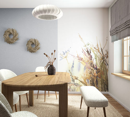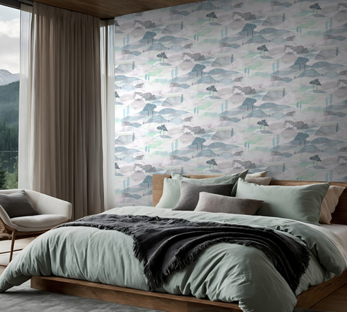 Les motifs paysagers de Boho transforment les murs en véritables horizons poétiques. Collines aux lignes douces, silhouettes d’arbres et compositions inspirées de la nature sont interprétées dans un style délicatement impressionniste. Ces décors apportent une sensation de calme et d’évasion, idéale pour créer une ambiance reposante et harmonieuse.