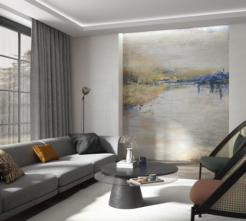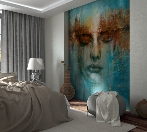 Visages énigmatiques noyés dans des brumes bleutées, lignes dorées évoquant l’horizon, reliefs organiques rappelant feuilles, courants ou rituels ancestraux : Ritus mêle art mural et émotion avec force. Les motifs jouent avec la profondeur visuelle, les effets 3D et les textures travaillées pour créer des décors à la fois puissants et contemplatifs.
