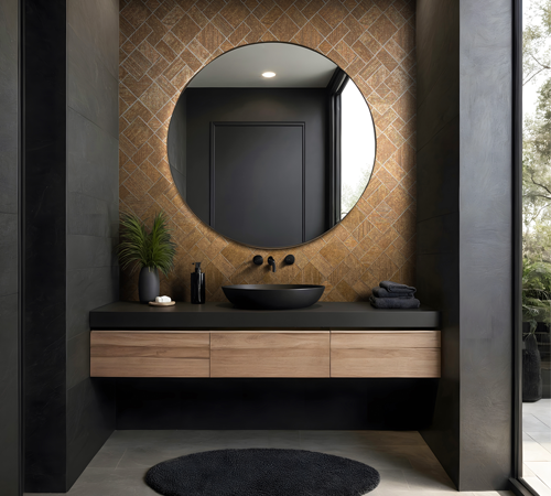 La palette chromatique oscille entre bleus brumeux, gris argentés, anthracite profond, bruns dorés et touches métalliques raffinées. Ritus est idéale pour créer des espaces empreints de mystère, de calme et de caractère : des intérieurs contemporains, urbains ou plus intimistes, où le mur devient un véritable élément narratif.