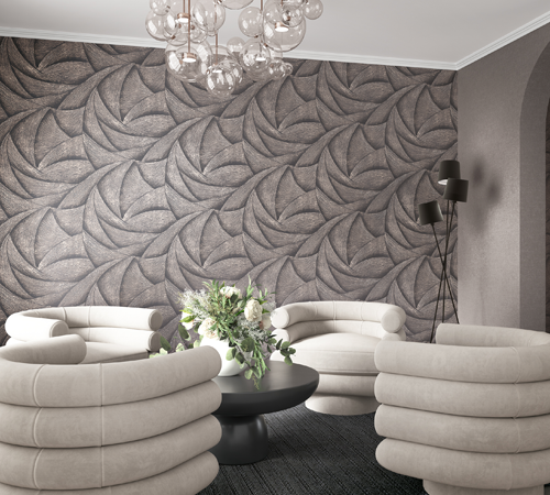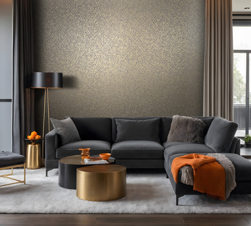 Reliefs structurés, surfaces patinées, effets métallisés subtils, jeux de lumière et de matière donnent aux murs une présence presque sculpturale. Certains modèles évoquent l’esprit industriel avec des effets bois oxydé ou patchwork géométrique, tandis que d’autres misent sur une élégance plus douce, avec des structures fines proches du textile ou des reliefs floraux délicatement dorés.